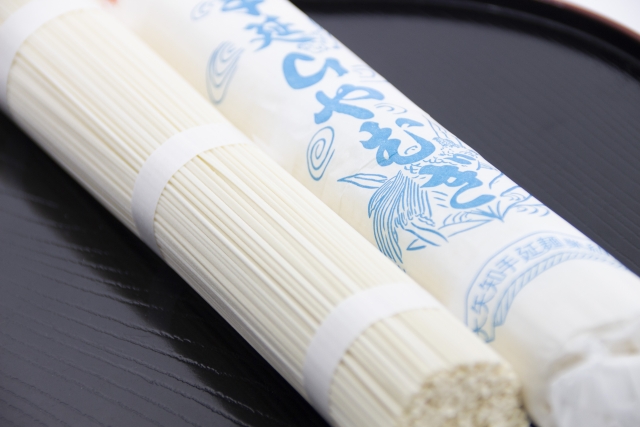 まずそうめんの起源は、奈良時代に中国から伝わったとされる「索餅(さくべい)」という食べ物にあると言われています。索餅は小麦粉と米粉などを練り、細く縄のようにねじって作ったお菓子や点心のようなものでした。これが時代とともに進化し、鎌倉時代から室町時代にかけて、現在の細い手延べそうめんの形に発展していきました。そのため、そうめんは歴史的に宮廷や貴族の間で食べられる高級品という位置づけでした。